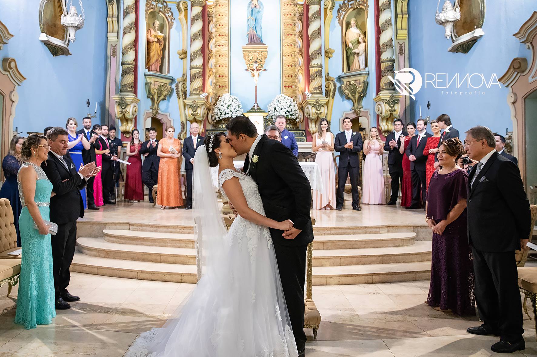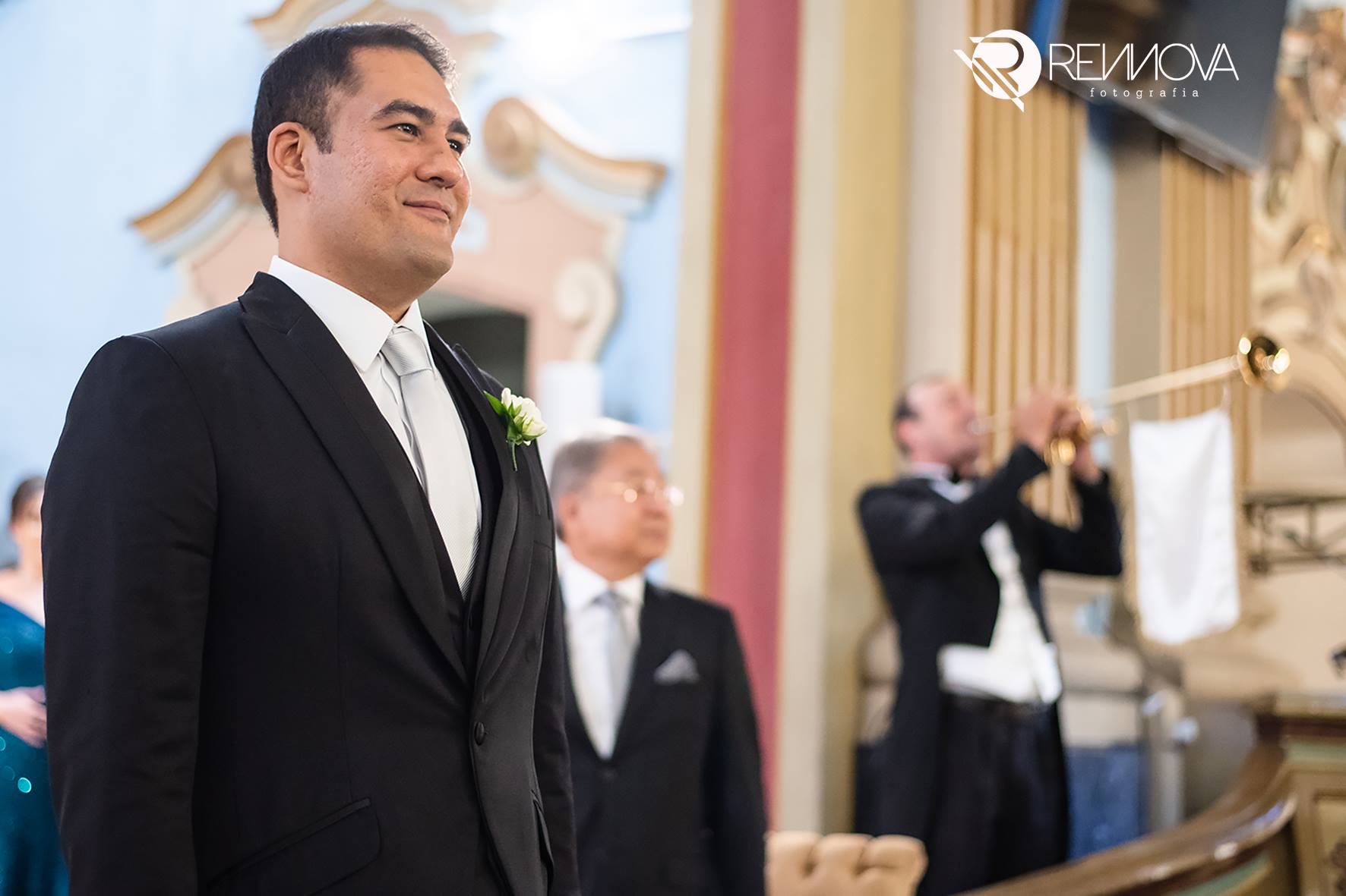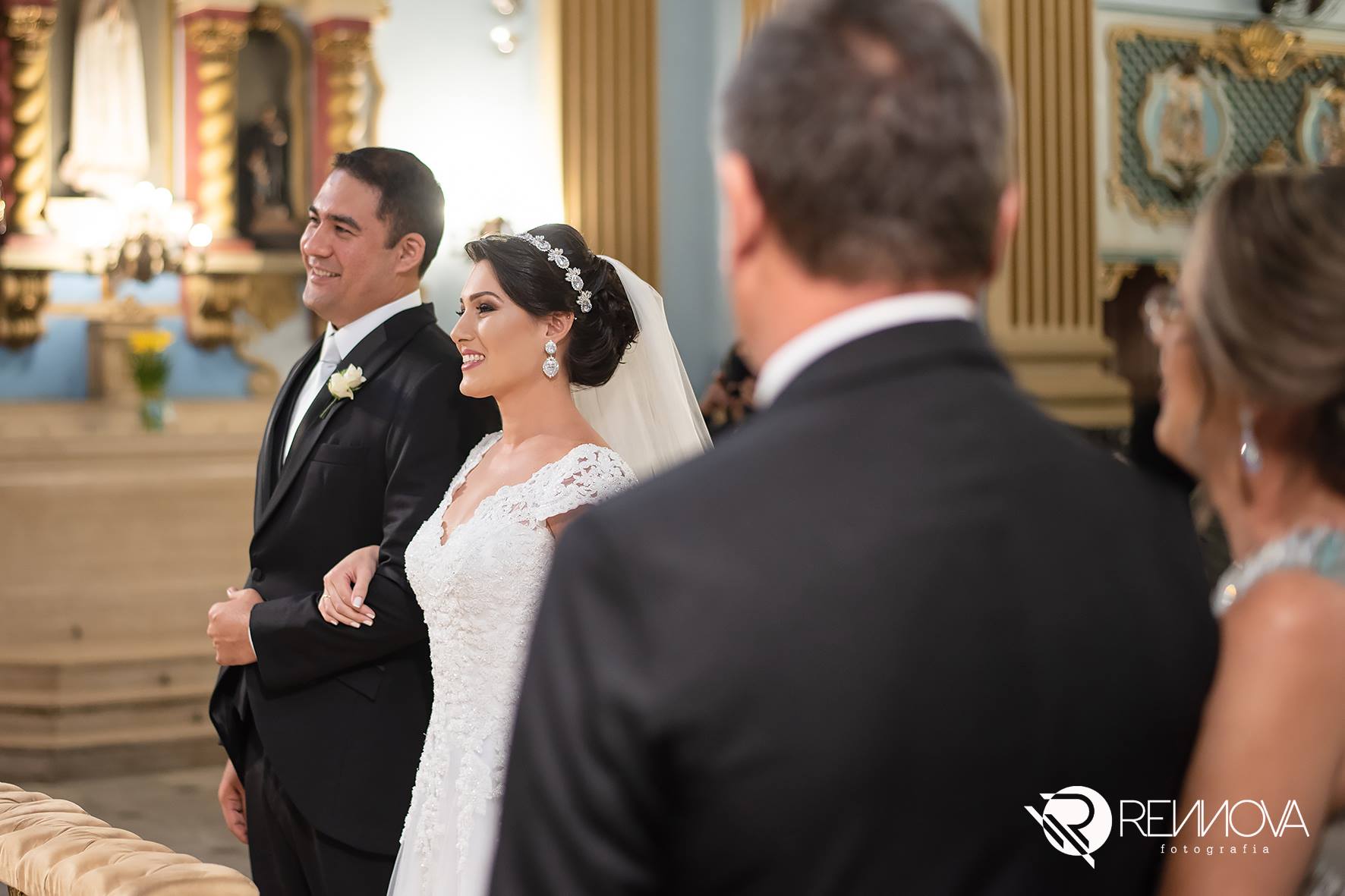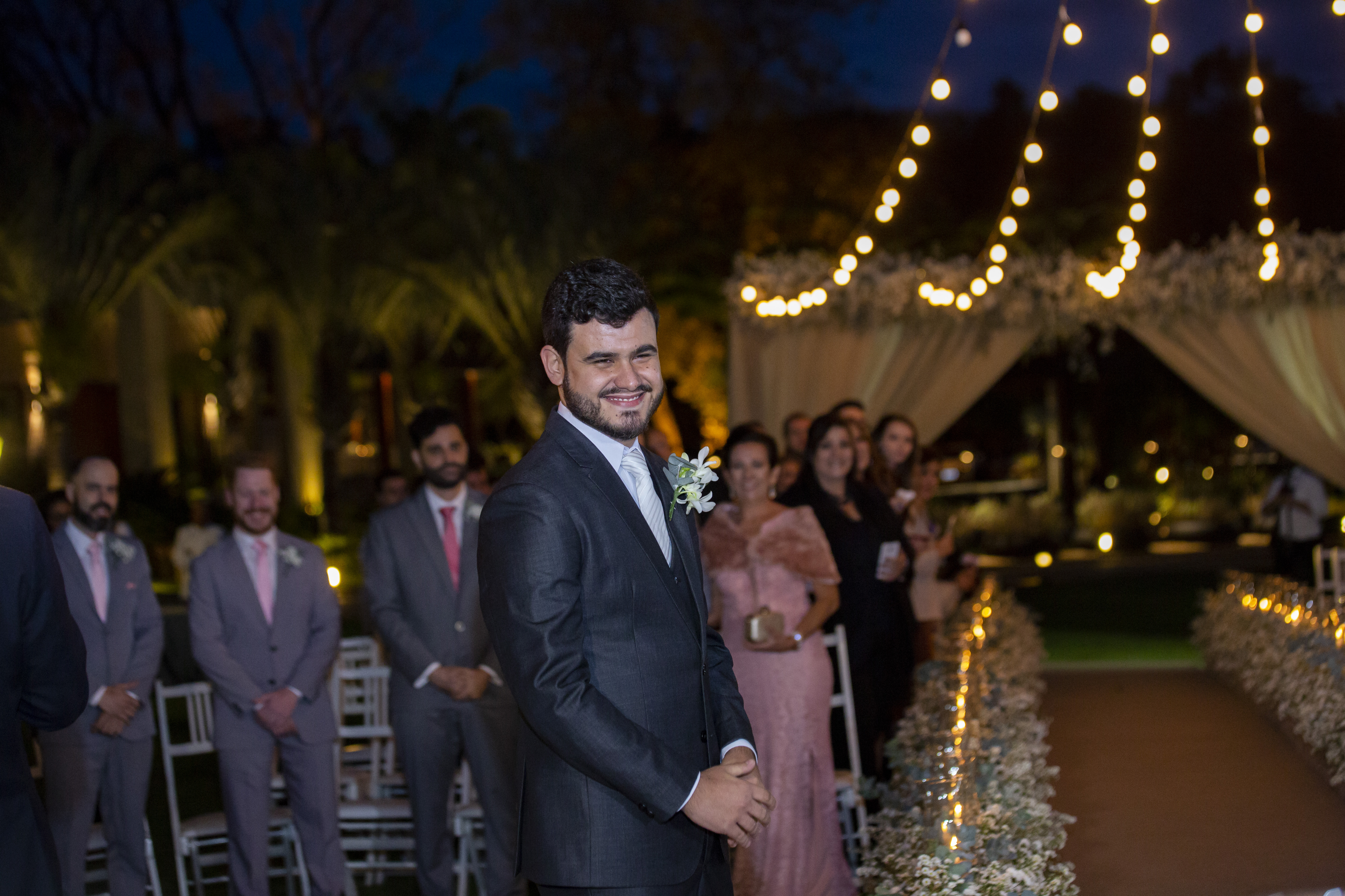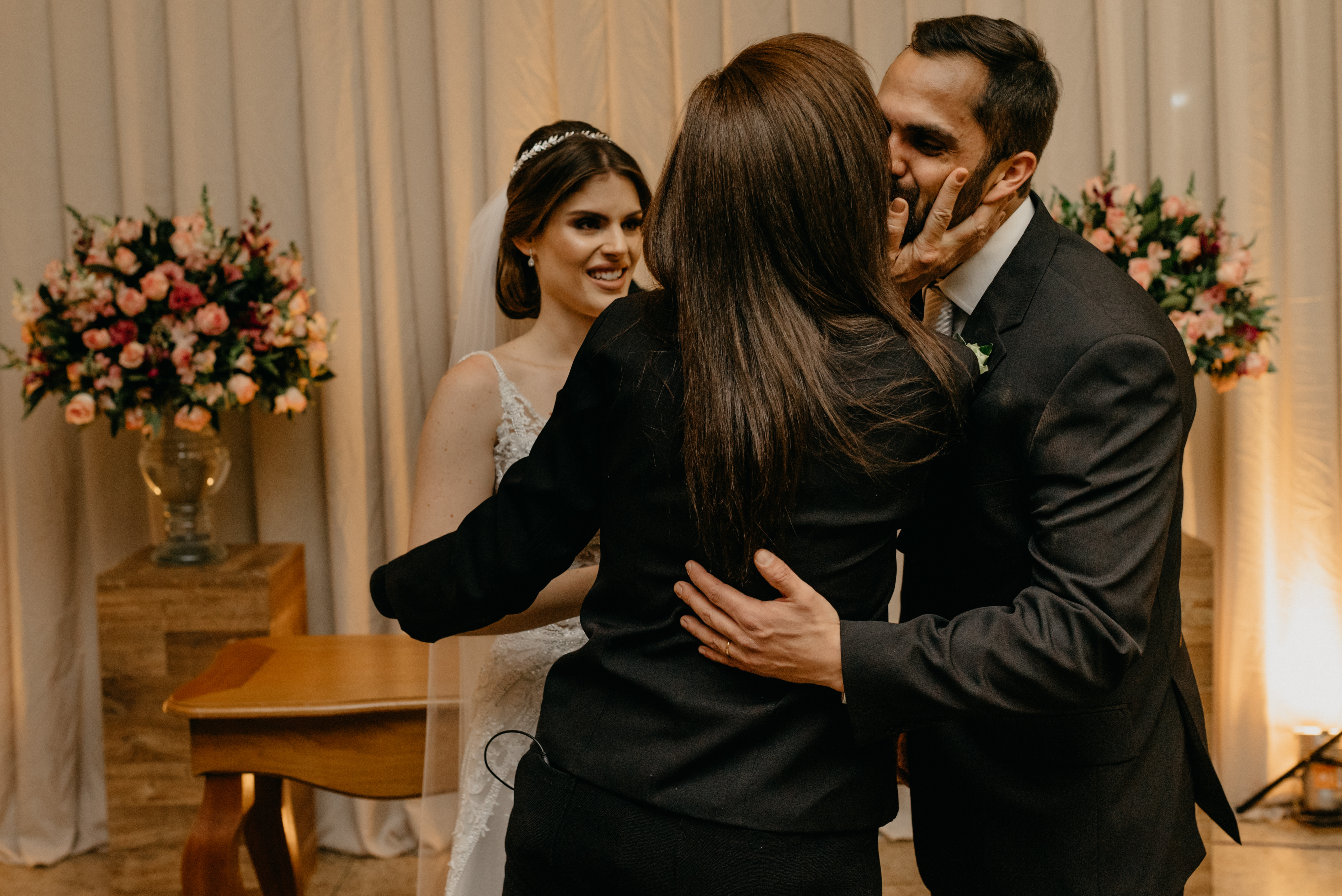 Tivemos algumas surpresas para a noiva, como o sobrinho que mora longe… ele veio na época do casamento – 31.05.18 e depois não conseguiria estar de volta ao Brasil na nova data, mas deu um jeitinho e veio fazer surpresa! Tanto que uma das fotos expressa a surpresa e felicidade ao olhar e ve-lo no altar, junto dos demais padrinhos!