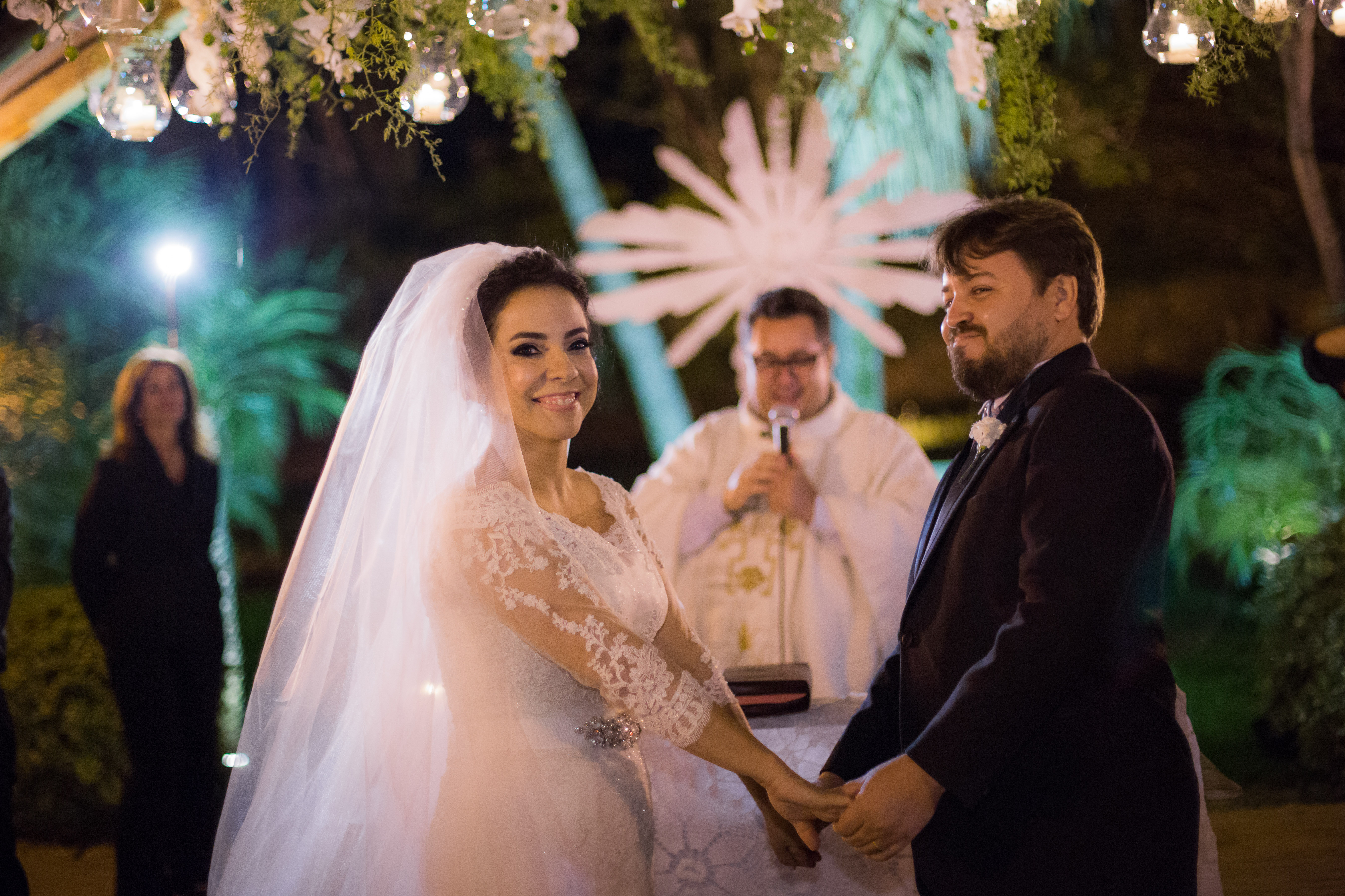Tivemos uma cerimônia linda!!! Em todos esses anos de trabalho, acredito que não tenha visto padrinhos se emocionarem tanto… realmente foi lindo! Os votos que os dois fizeram foram maravilhosos, e realmente tocou muito! Um padre amigo da família celebrou com muito amor e carinho ao casal!