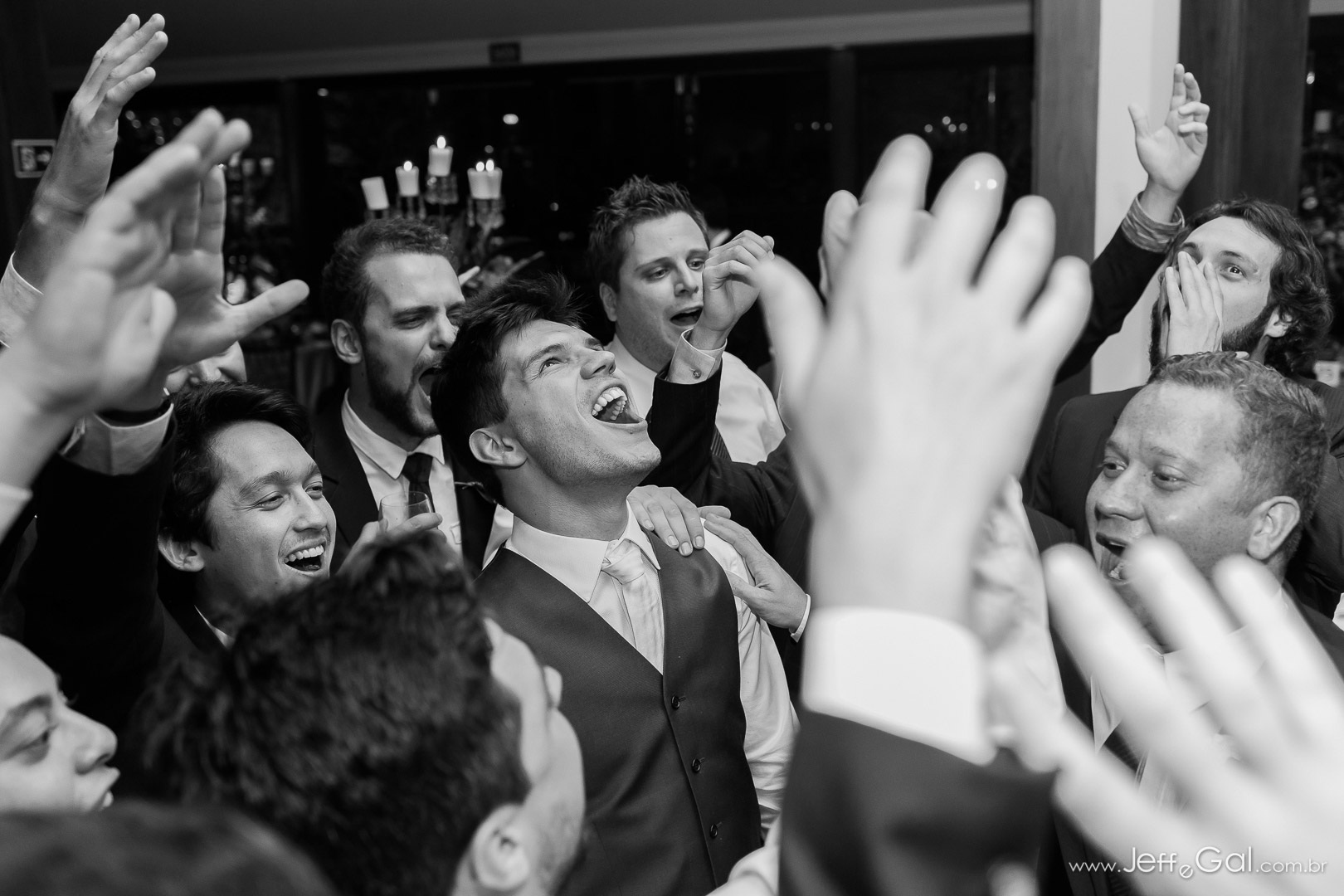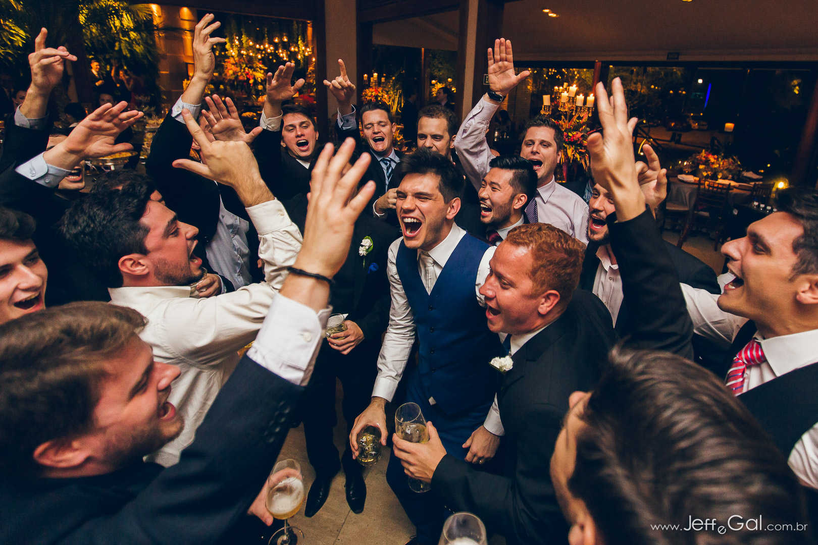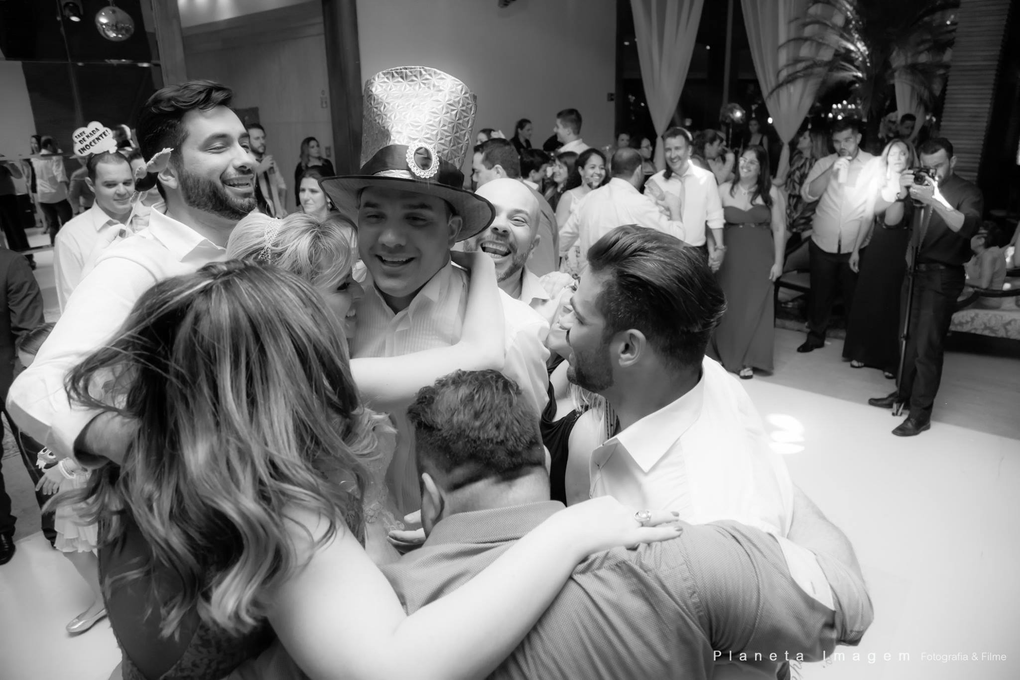 A festa foi super divertida, pista animada demais!!!! Quando olho na pista o noivo está de meias… perdeu os sapatos, de tanto que dançou, aproveitou… e claro, uma brincadeirinha dos padrinhos!
