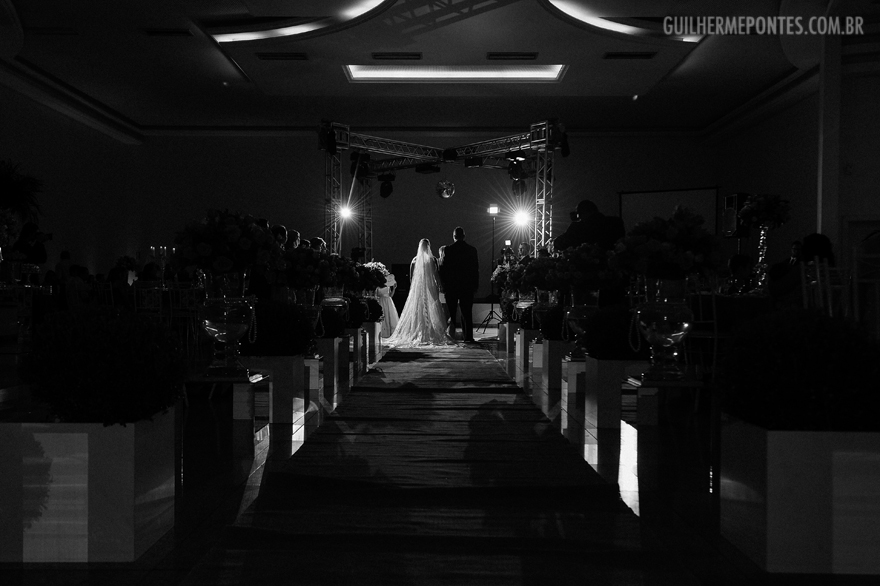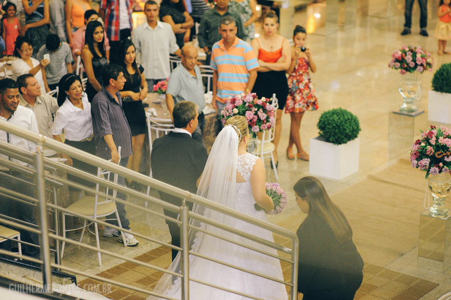 Os noivos entraram lindamente, ela sorrindo, de braços dados com o pai, feliz indo ao encontro do noivo, que emocionado já estava a sua espera!