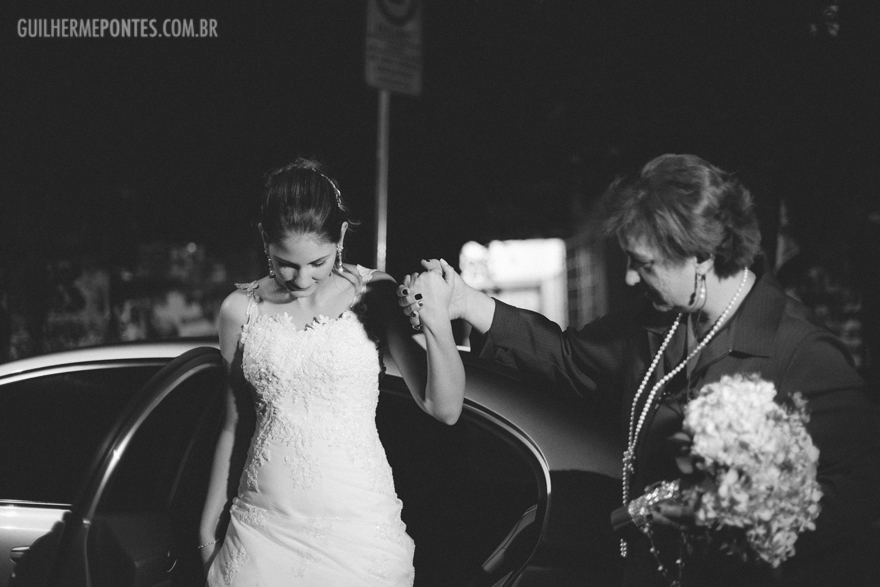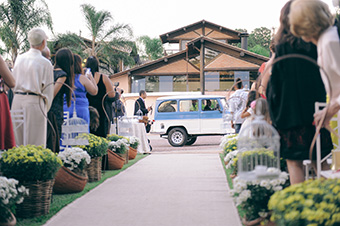 A noiva entrou ao som da Marcha Nupcial na Viola Caipira e chegou de Rural (aquele carro antigo). Na Cerimonia tinha água aromatizada, leques de madeiras pros convidados, arroz e bolinha de sabão para a saída dos noivos.