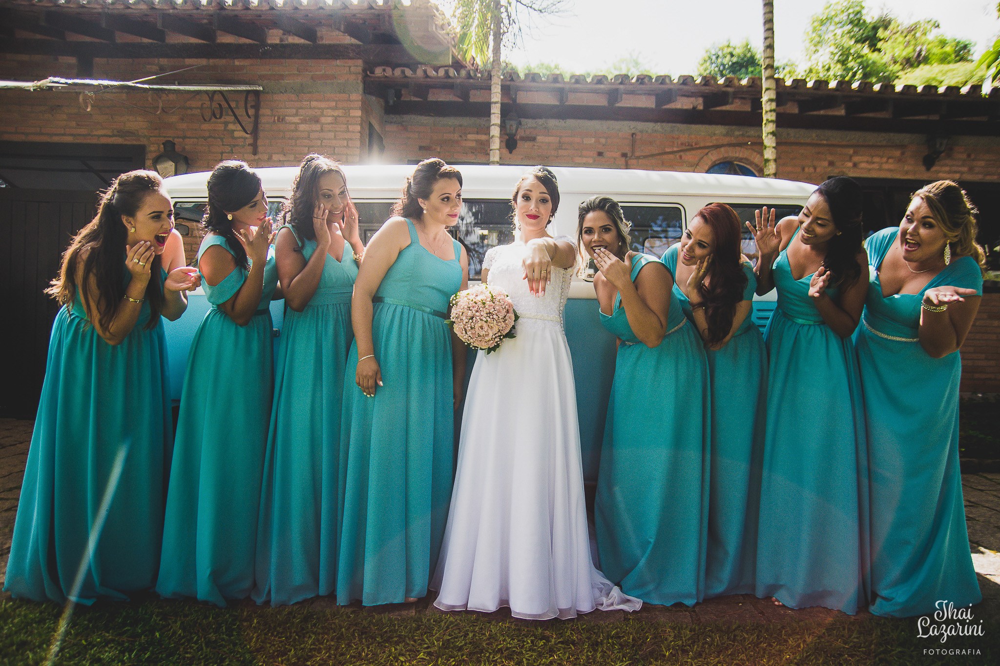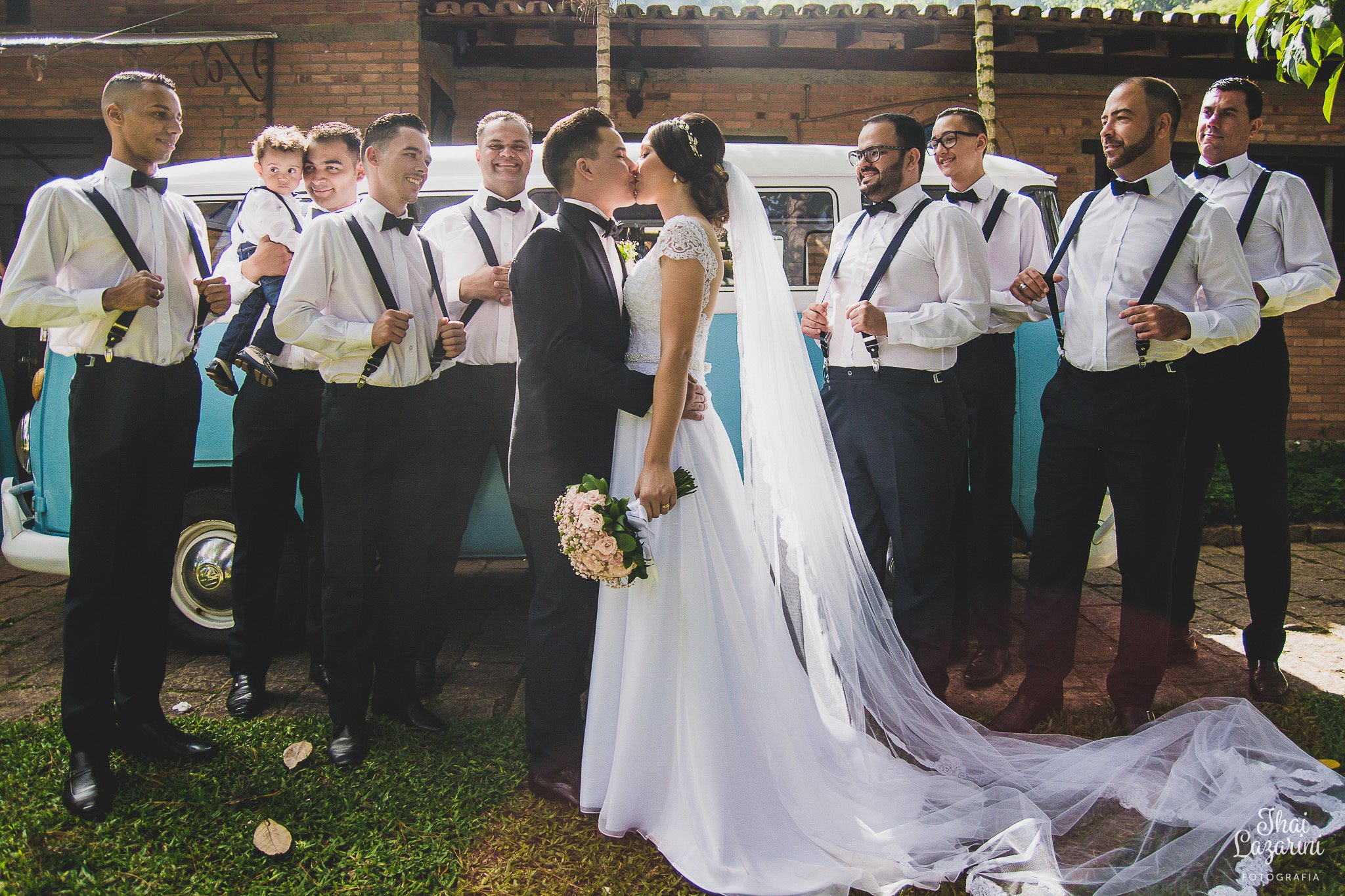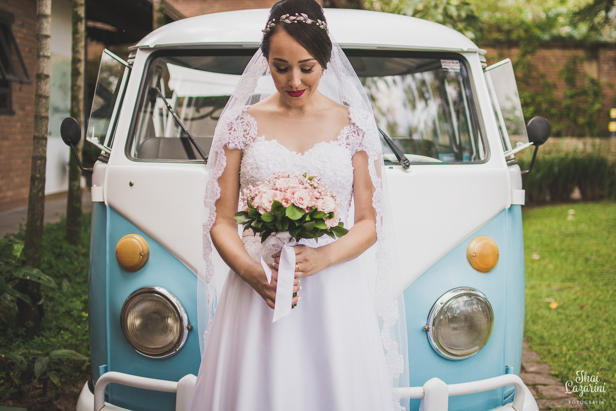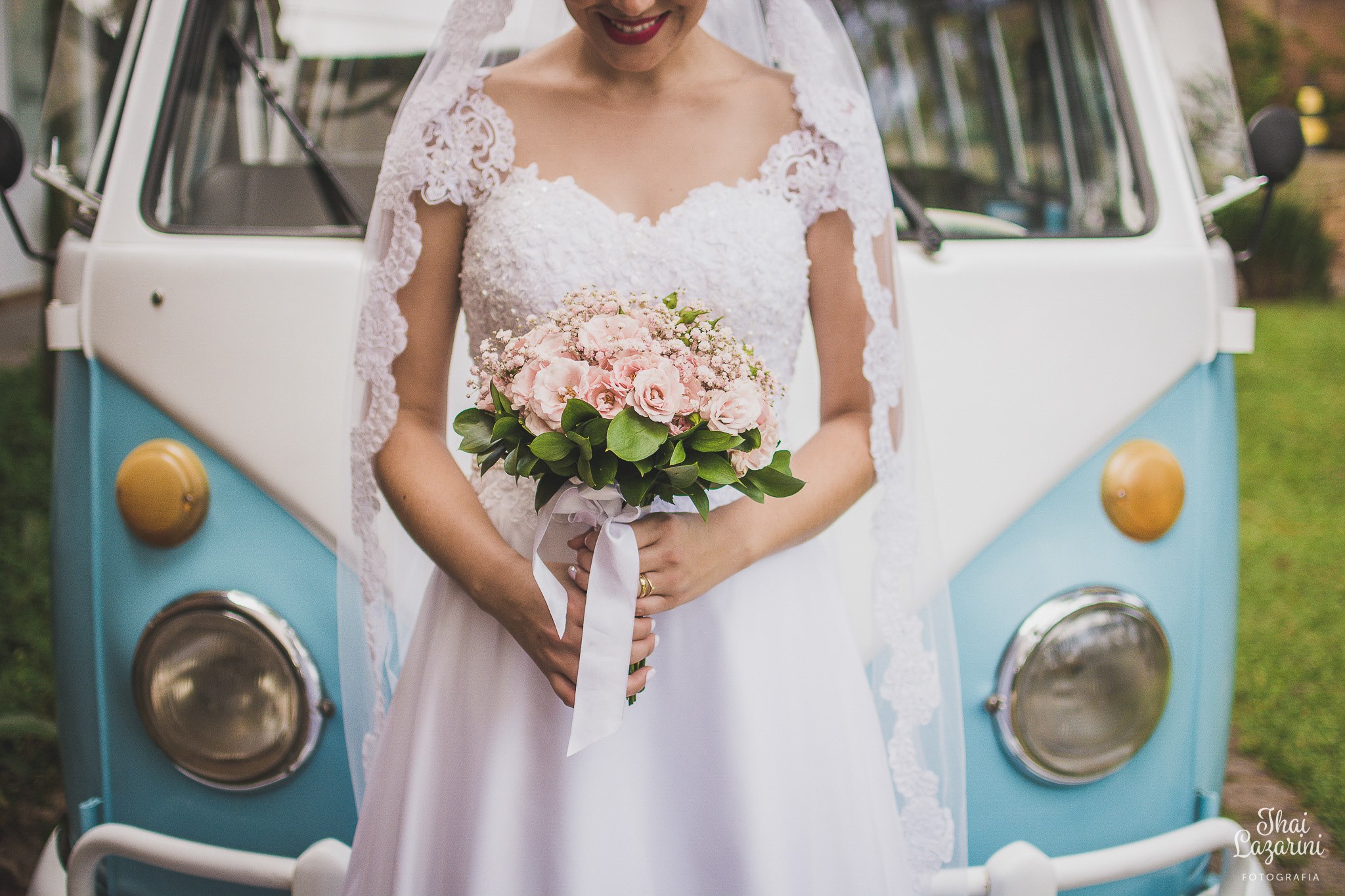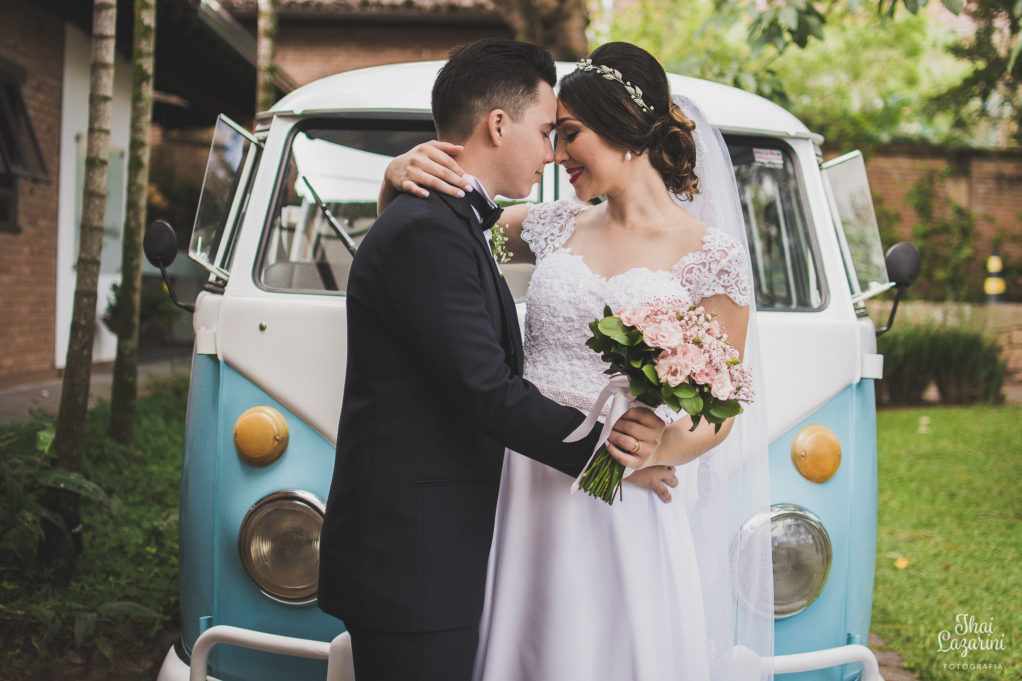 Depois dessa linda cerimônia tivemos o ensaio fotográfico dos noivos, que para a realização do sonho dela, entrou com uma Kombi! Perfeita para o local, horário do casamento, decoração, tudo combinando… aquele cenário lindo, com a Kombi Azul ![]()