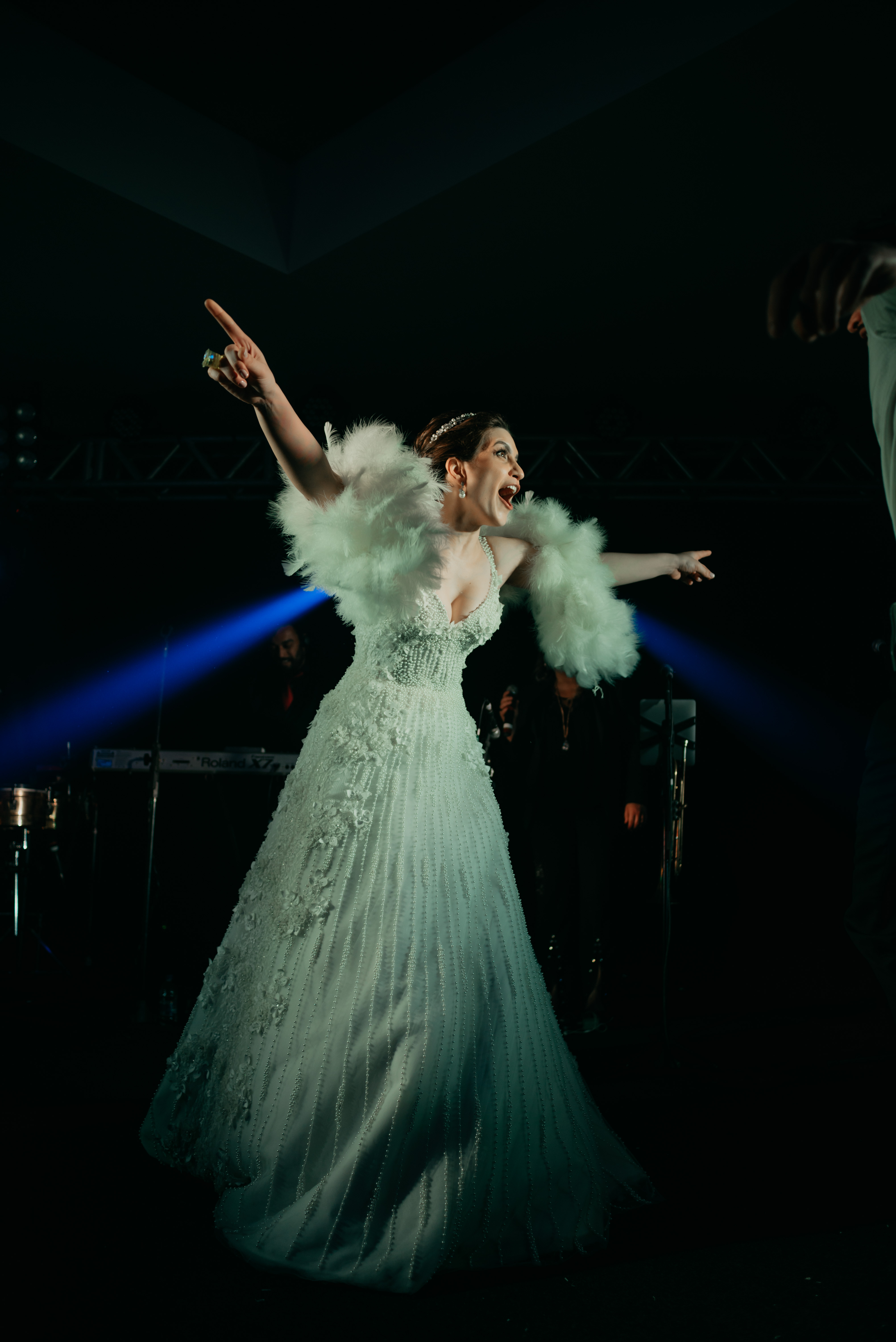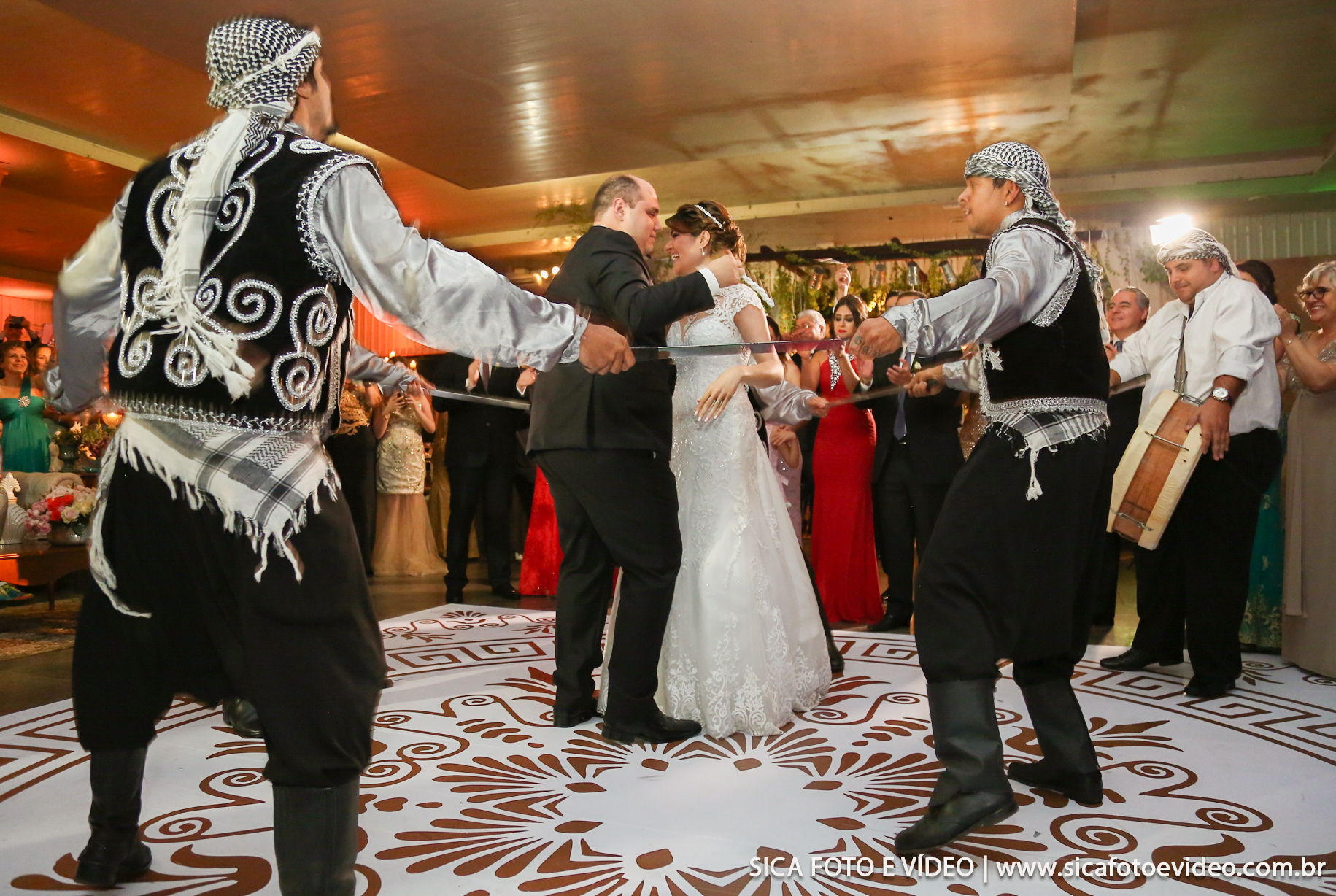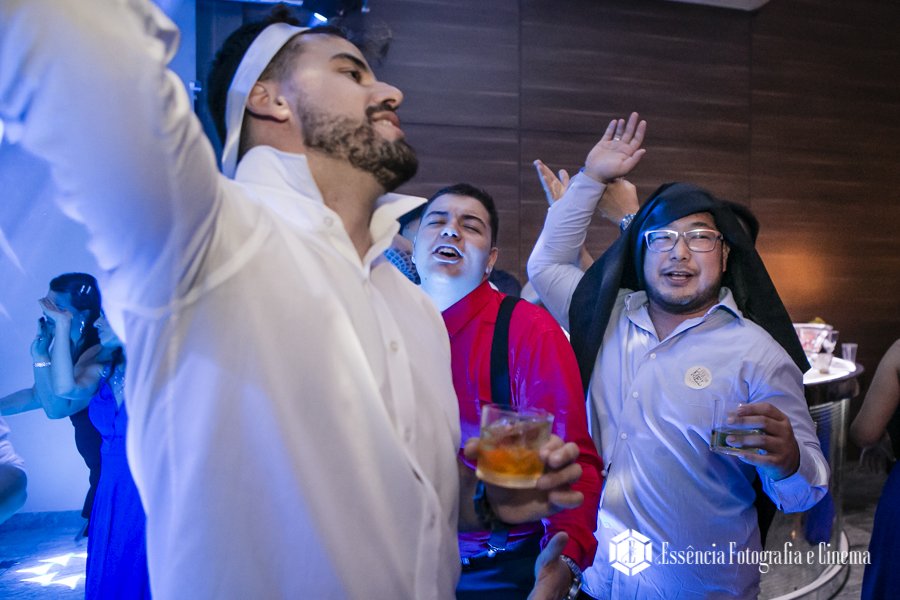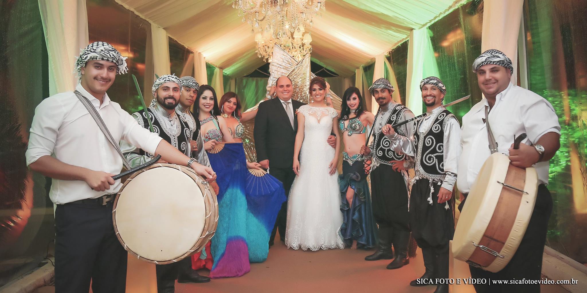 Depois tivemos uma festa e tanto!!!! Começou com a entrada dos noivos no salão escoltados por uma “banda árabe”, que foi muito animada e diferente (achei demais)… Depois seguimos a festa! Difícil tirar esse pessoal da pista, pois ficou o tempo todo cheia! Era exatamente isso que eles queriam, festa e pista!