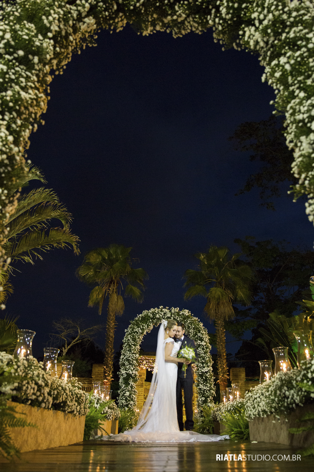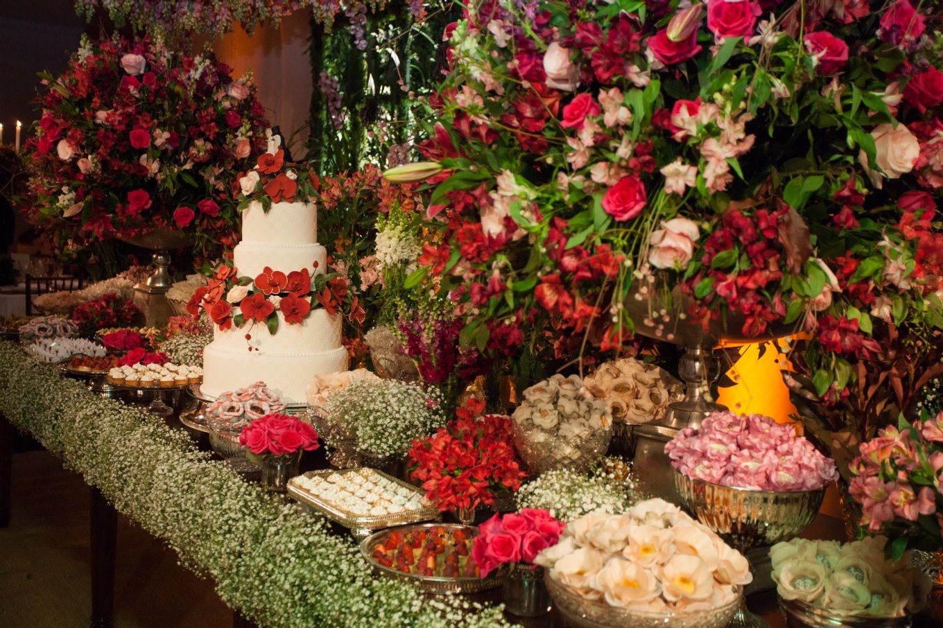 Deixamos para finalizar toda a decoração na “prorrogação”!!! Os profissionais envolvidos na montagem, todos torcendo, e por fim parou a chuva, bem a tempo da cerimônia ser realizada do lado de fora, mas não falei nada para a noiva, ao contrário, deixei em suspense… ela nem desconfiou, e achou que fosse casar dentro do salão!!!