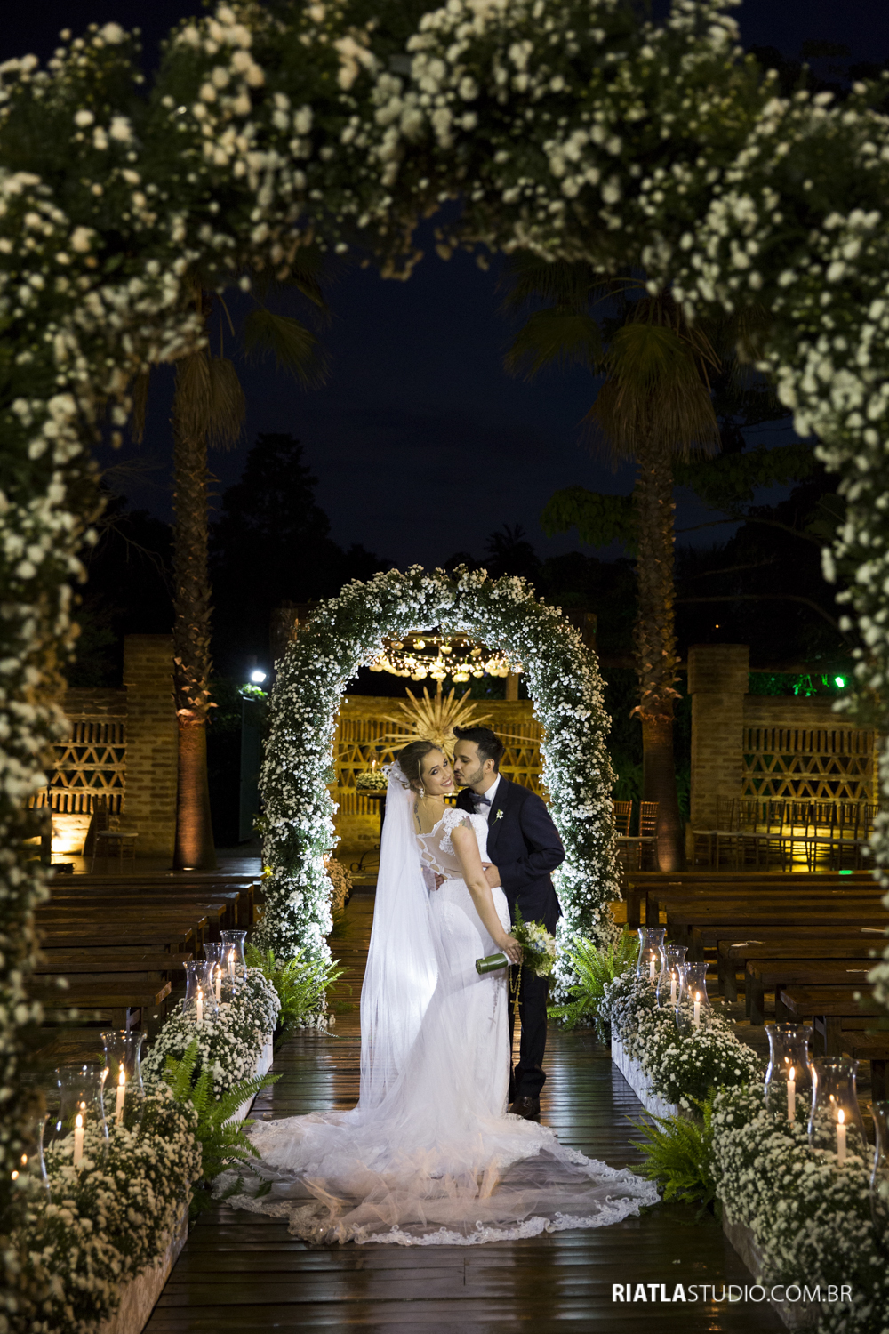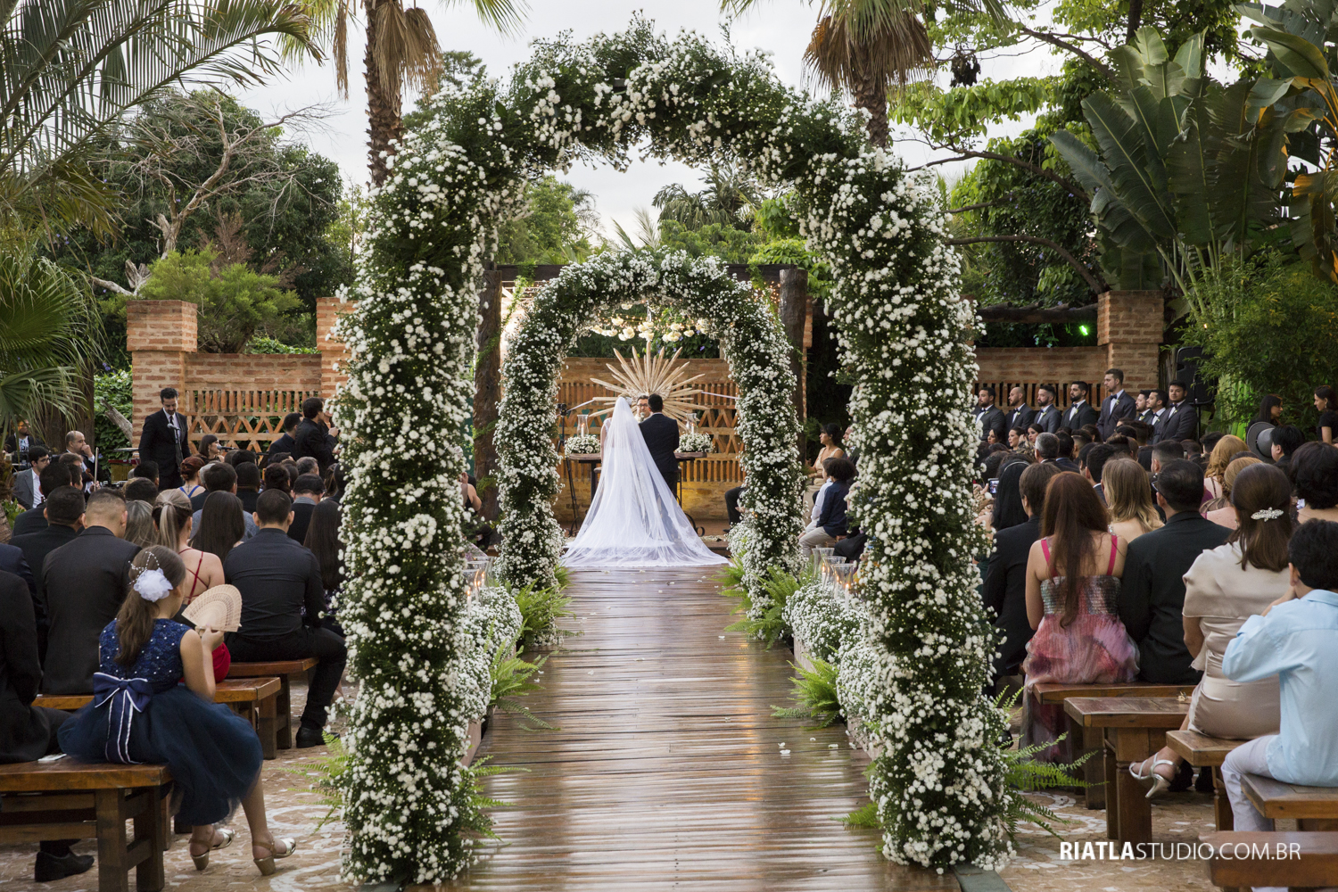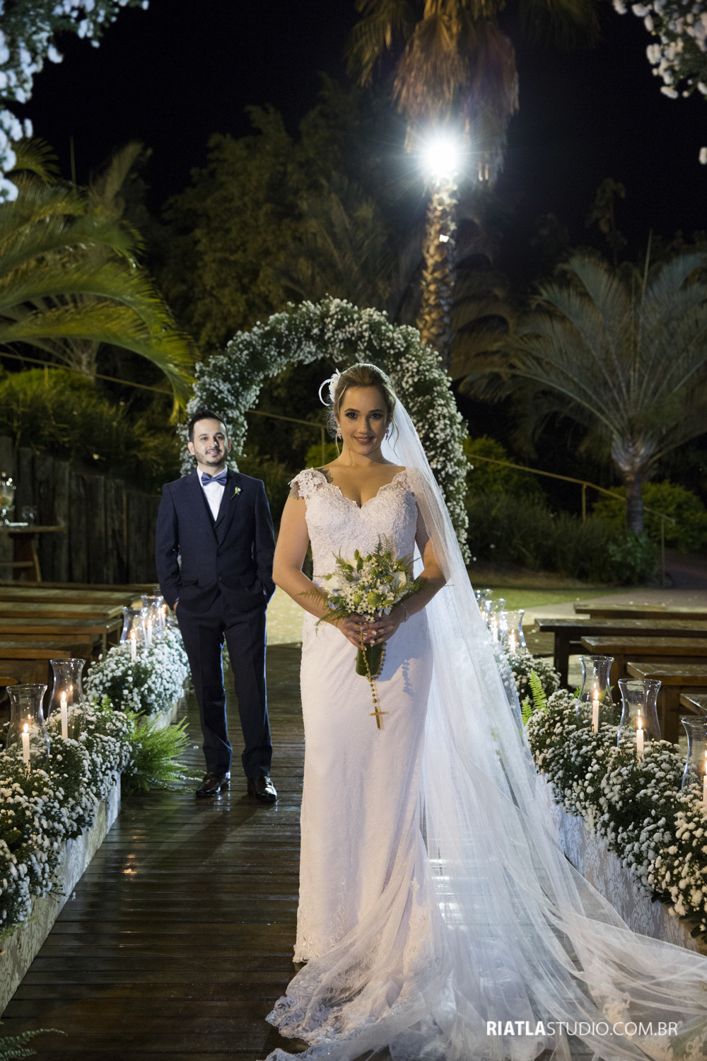 Na hora da entrada, quando estava prestes da tocar a marcha, ela percebeu que seria no local tão sonhado, entraria na cerimônia com seus arcos de flores, com um por do sol incrível!