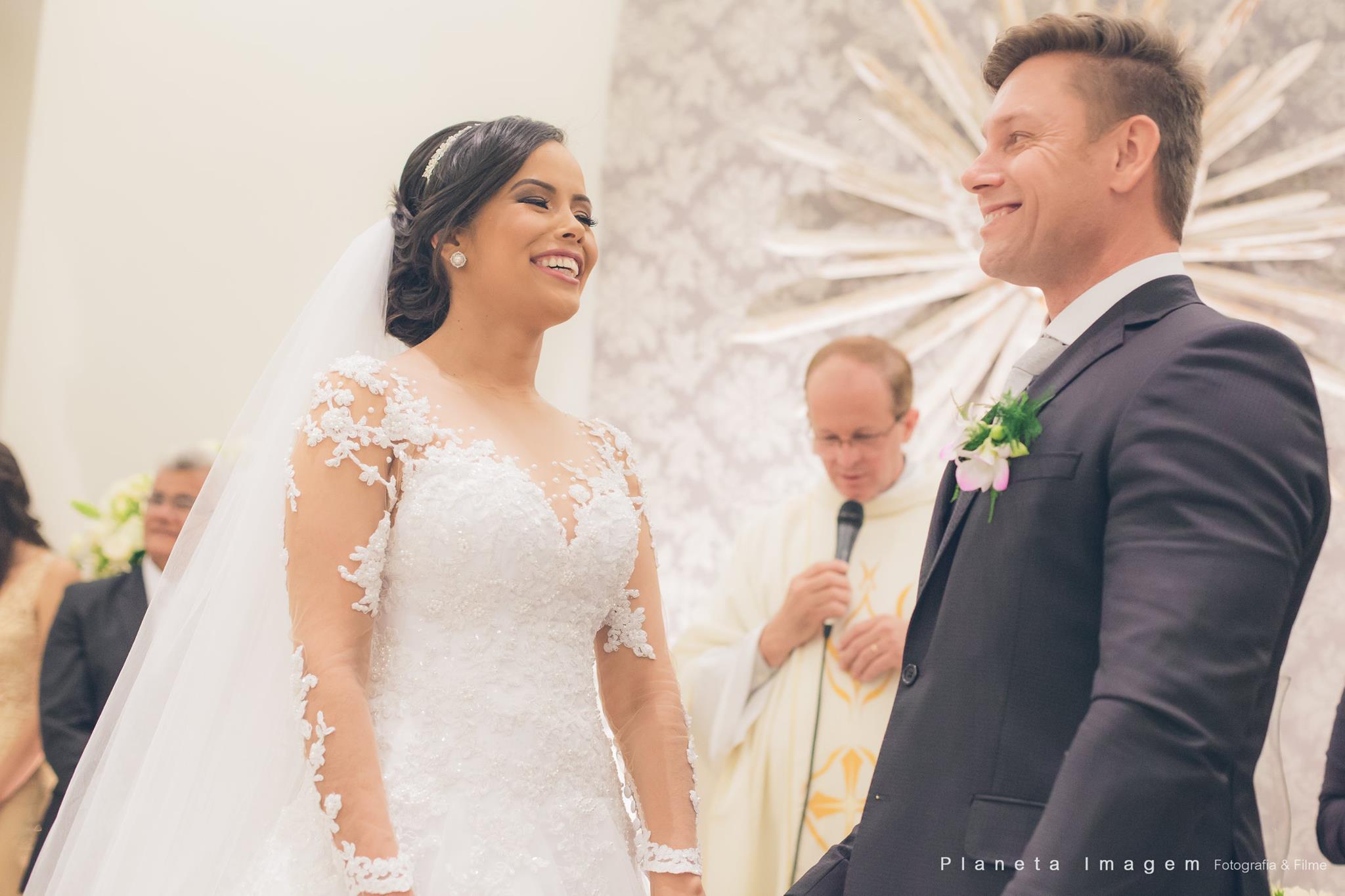 A cerimônia foi linda, sempre emocionante… noiva entra lindamente acompanhada pelo pai, sempre sorrindo e radiante! E assim foi toda a cerimônia, um sorriso lindo no rosto!